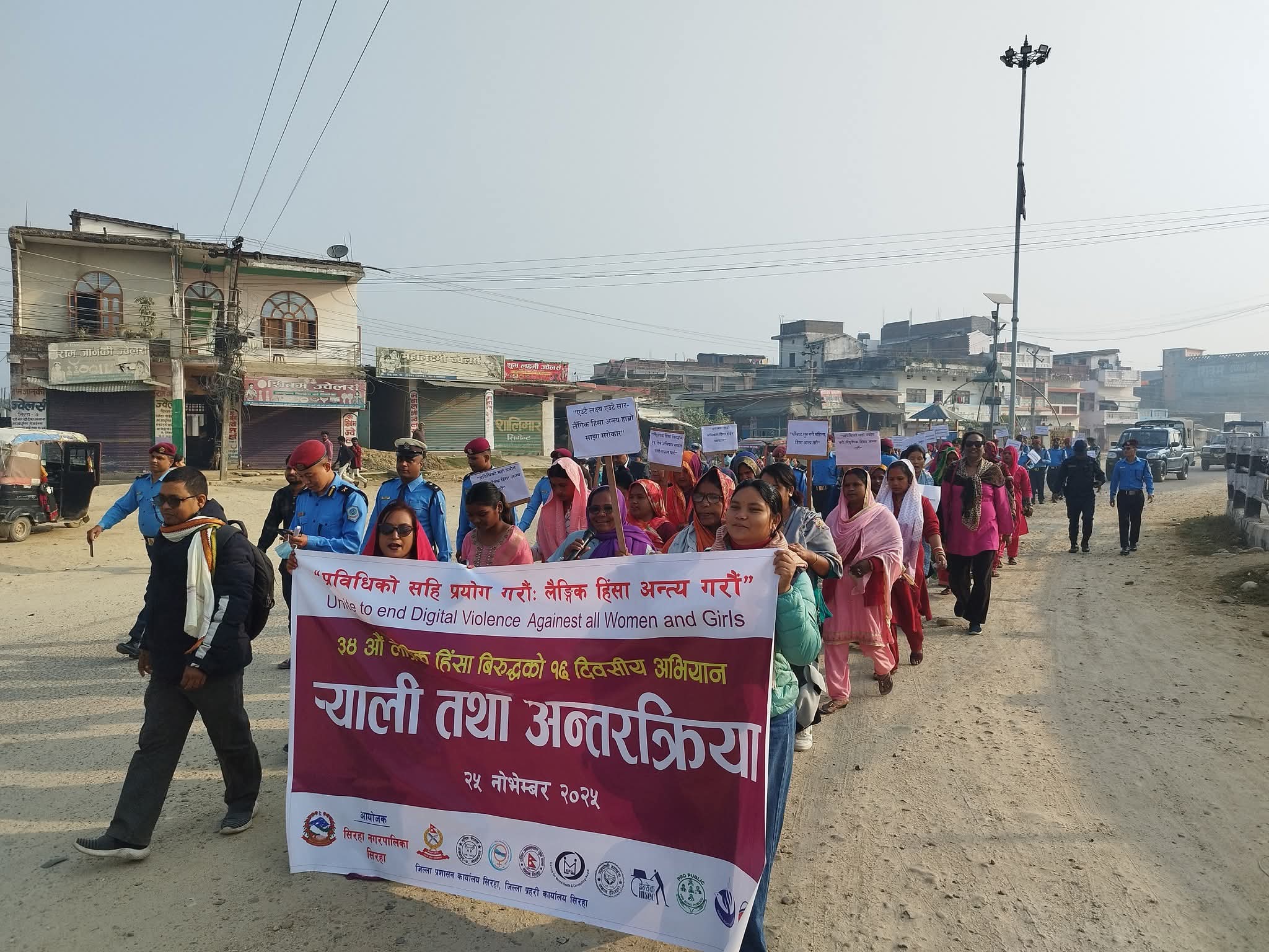 महेश सिंह सिरहा- लहान नगरपालिकामा ३८औँ लैङ्गिक हिंसा बिरुद्धको १६ दिने अभियान अन्तर्गत शनिबार जनचेतनामूलक र्‍याली तथा अन्तरक्रिया कार्यक्रम सम्पन्न भएको छ। ‘प्रविधिको सही प्रयोग गरौँ, लैङ्गिक हिंसा अन्त्य गरौँ’ भन्ने नारा सहित आयोजित र्‍यालीमा स्थानीय महिला समूह, सामाजिक संस्था, सुरक्षा निकायका प्रतिनिधि र नगरका अधिकारीहरूको सक्रिय सहभागिता देखियो।